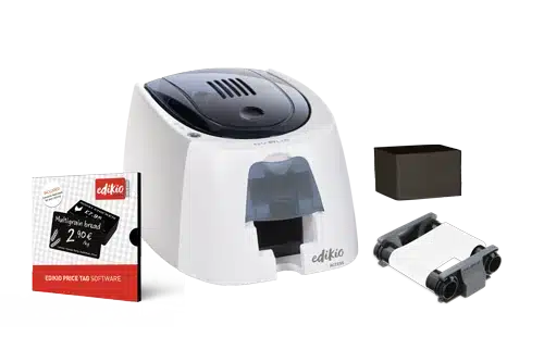 Compacta y fácil de integrar en tu espacio de trabajo, la impresora Edikio Access permite imprimir etiquetas de precio a una sola cara en formato tarjeta de crédito.